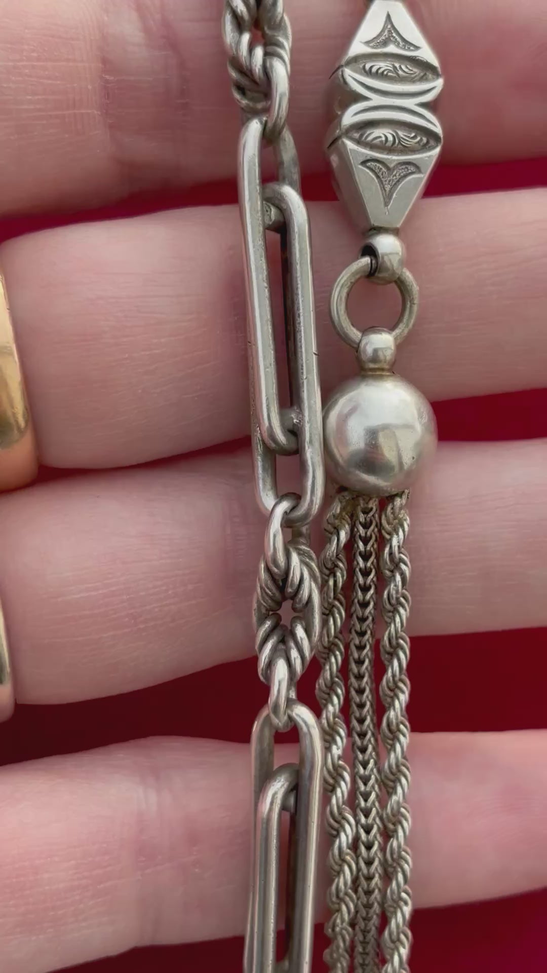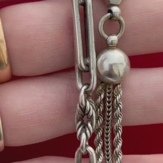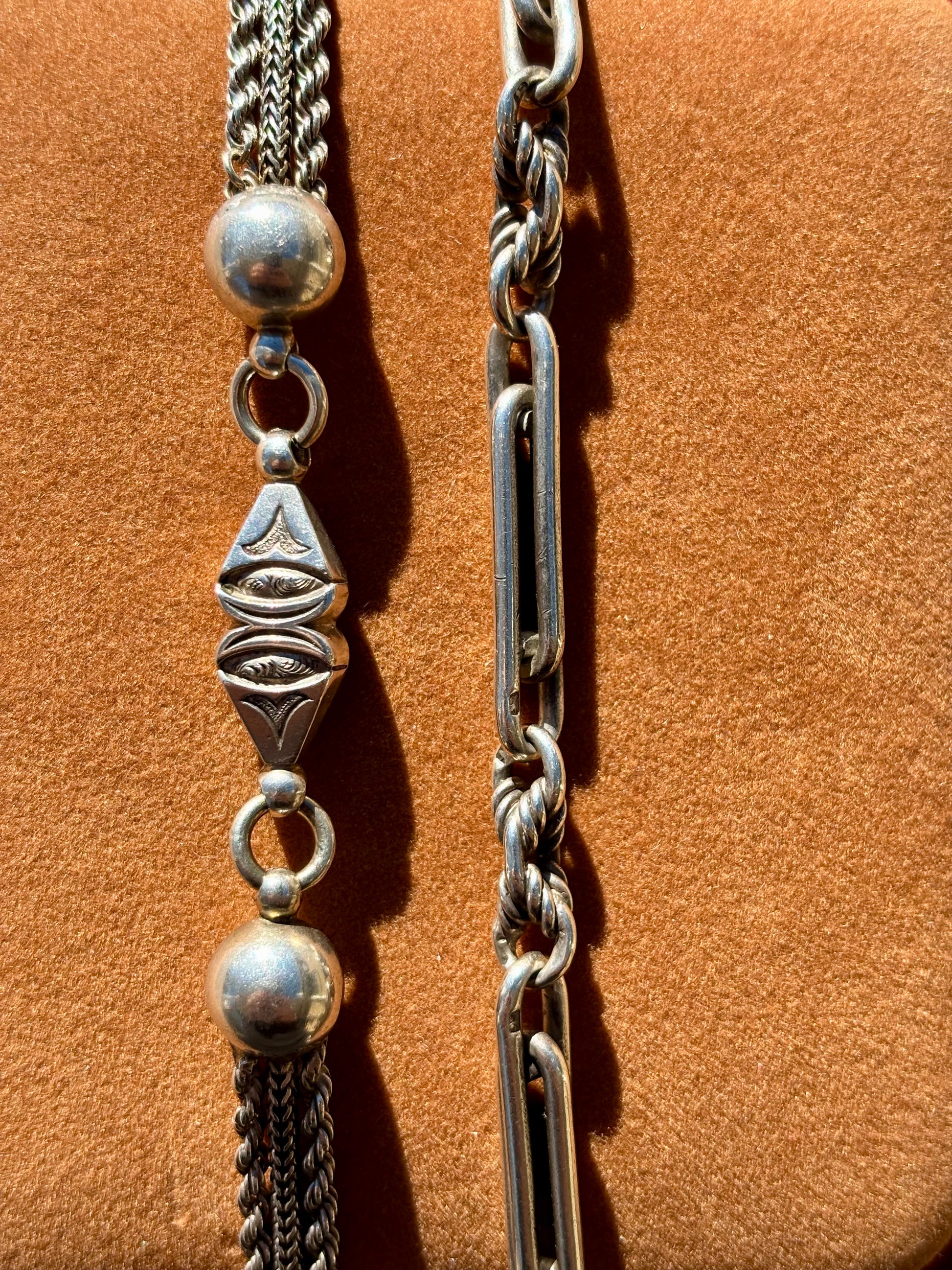 This delightful and chunky piece of silvery goodness was once two different pocket watch chains. The chain with the 4 balls, lengths wheat & rope style chains and the fantastically carved decorative fob is called an "Albertina" chain. Albertina chains were worn mostly by women in the Victorian era, and were used to hold their pocket watches or worn decoratively as bracelets. The Albertina name is in reference to Prince Albert, Queen Victoria's husband who popularized the trend of having a cool and ornate watch chain.