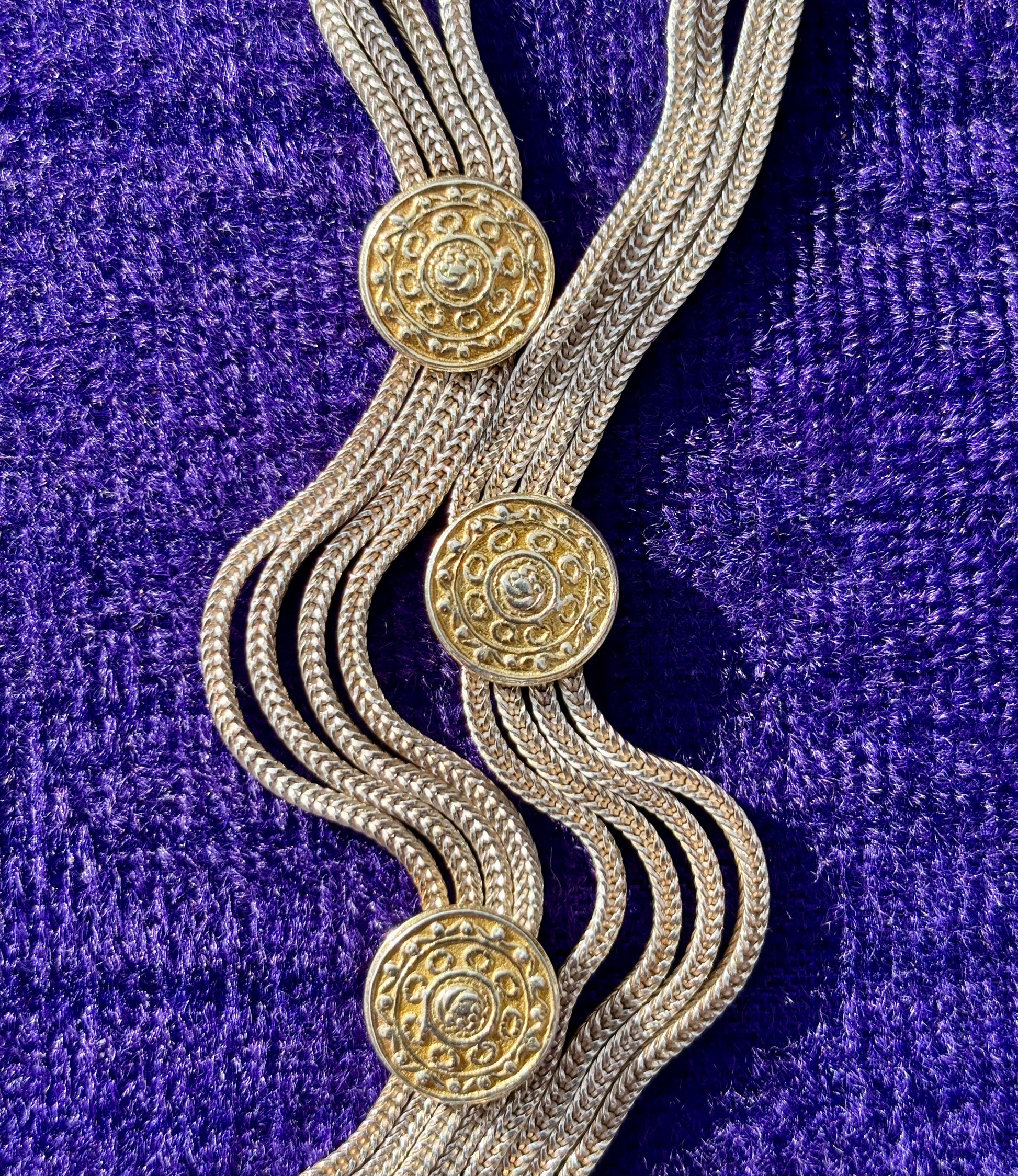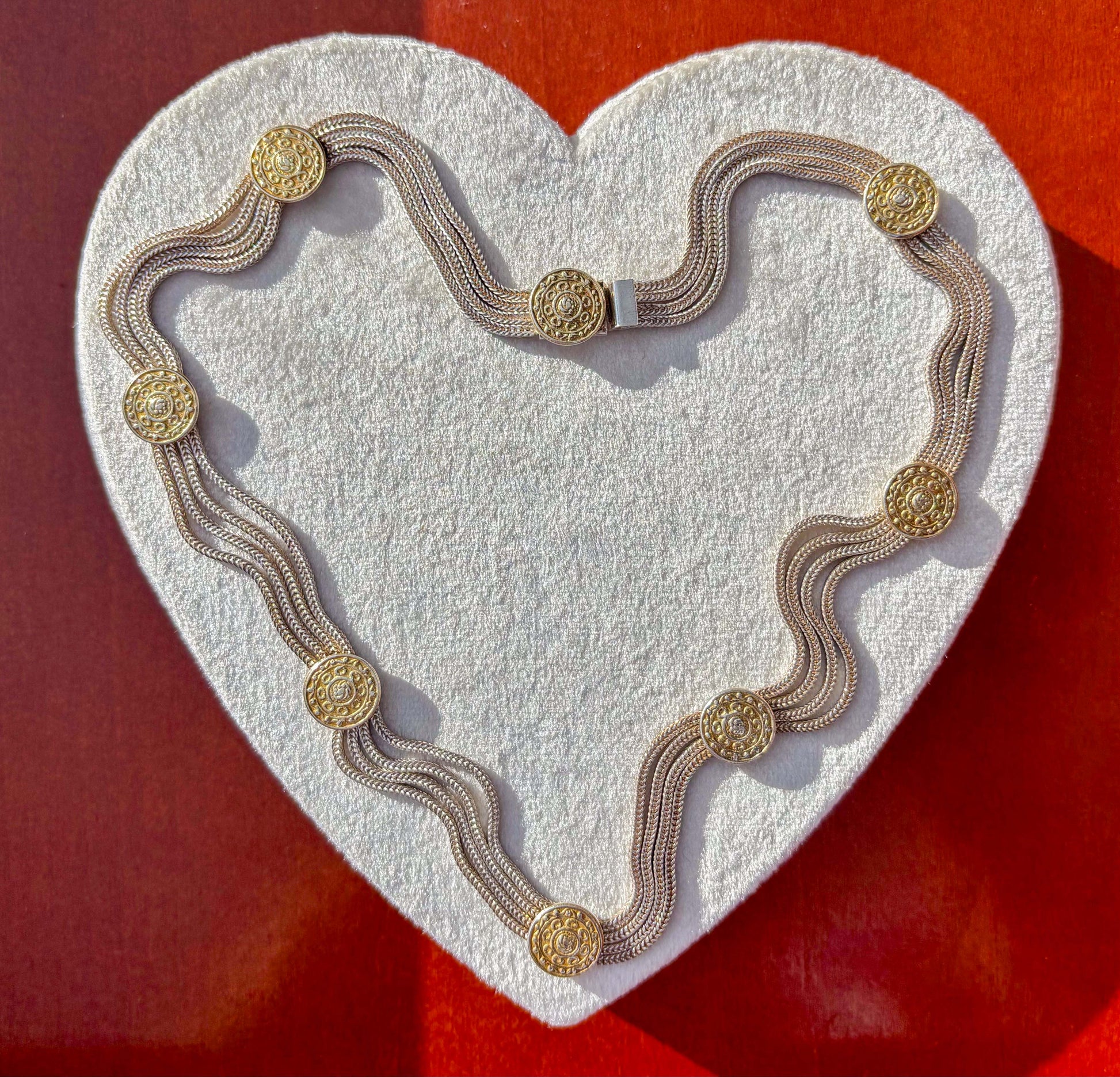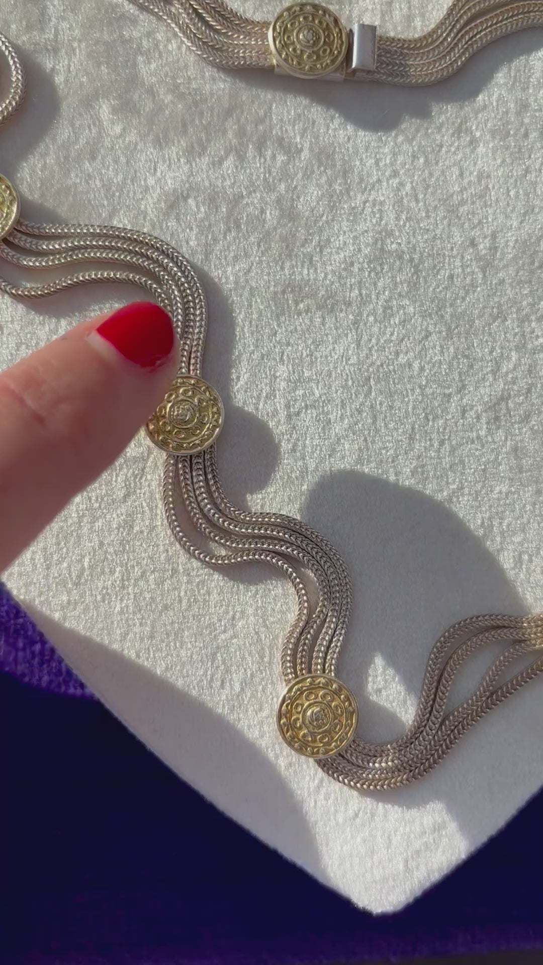 4 strands of wheat (also sometimes called foxtail) chain is segmented by 8 coin-like discs. The chain is very sensuous, flexible and has a lot of movement. The very thoughtful design of the multiple strands allow the chain to drape perfectly so that it lays flat as it moves with you. The clasp is hidden behind one of the coins for an uninterrupted, symmetrical look. Cool, classic and timeless- a very rich look.