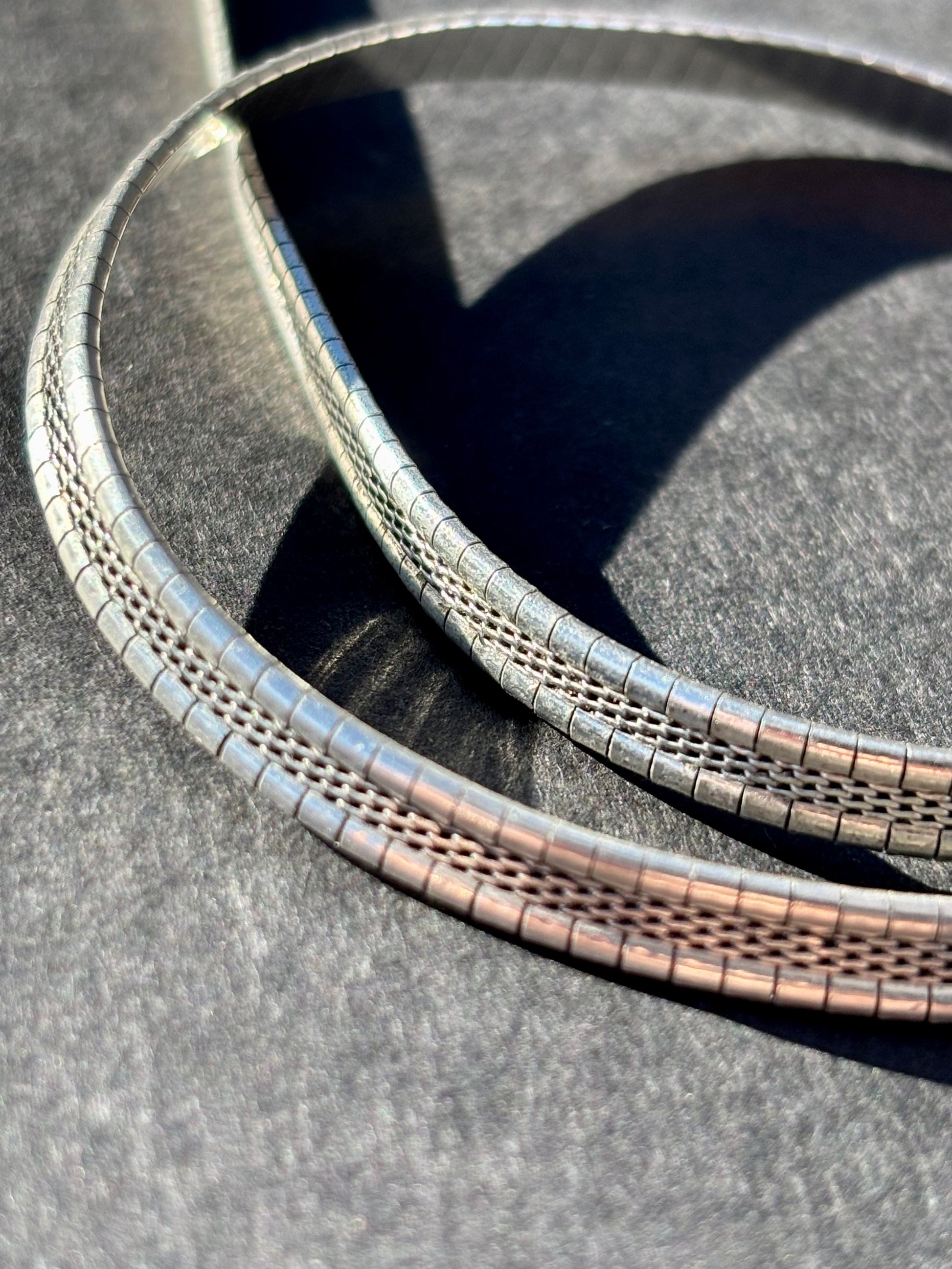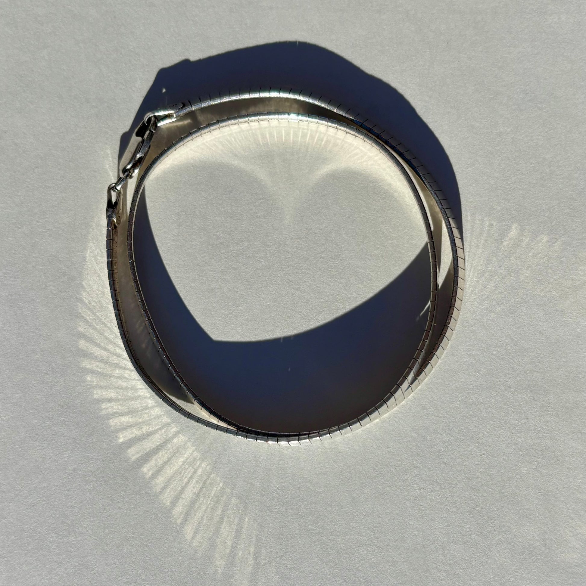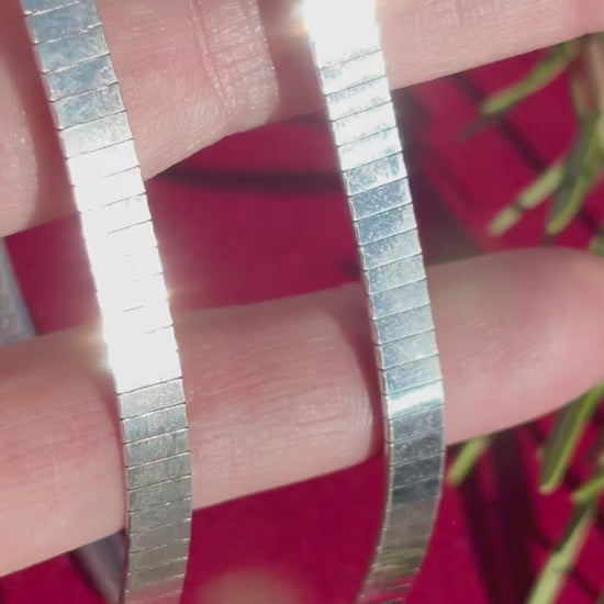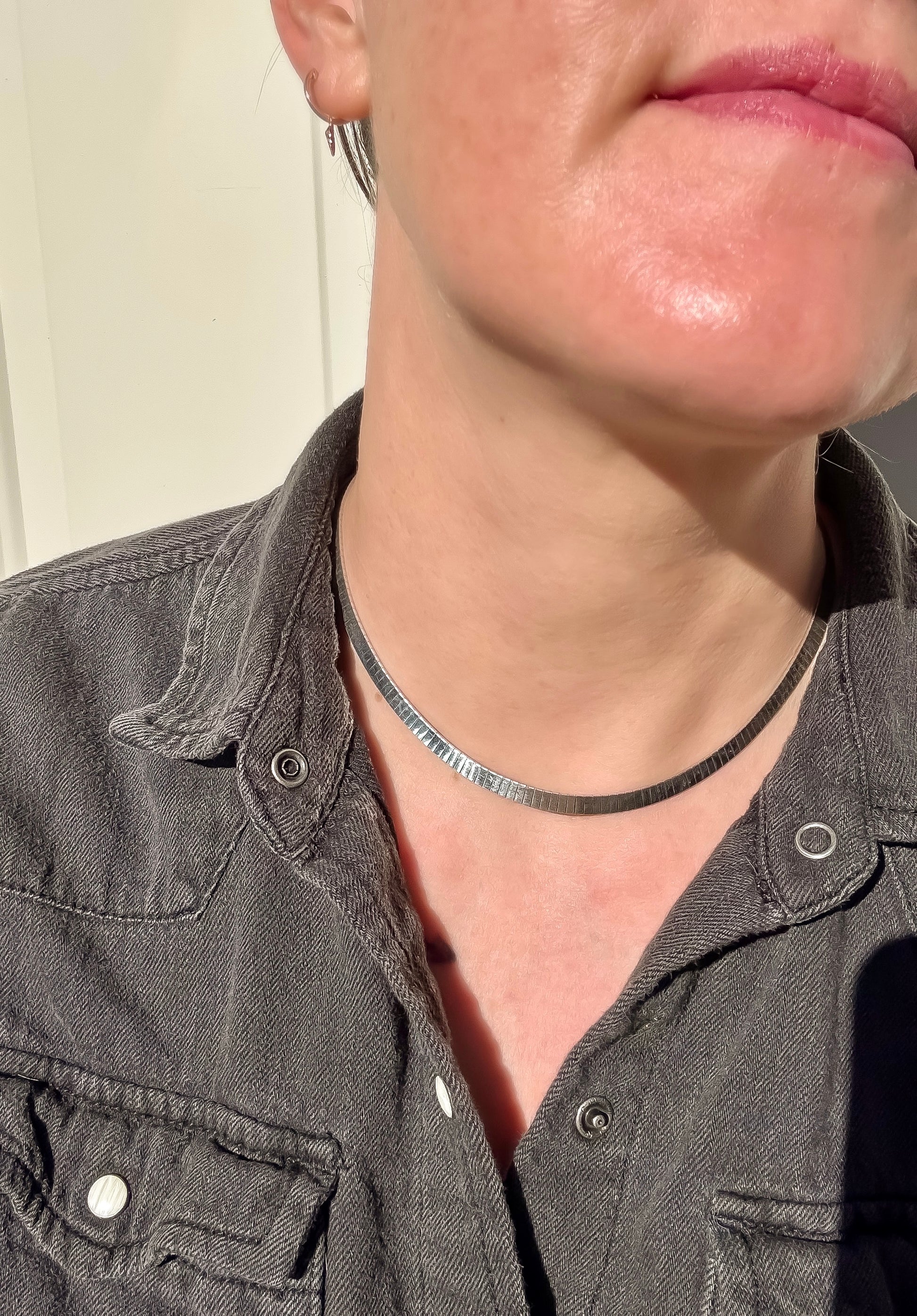 Omegas are classic for a reason!! They are workhorses, acting as a simple, stunning collar while also being able to handle bigger, weightier pendants if you choose to add one. This chain is a bit different- slim little slivers of silver are all lined up in neat little rows. When it catches the light, the facets gleam with a glittery, disco ball light show! The curved, segmented design creates a sturdy collar with a flexible, comfortable fit. The thing I love most about flat laying chains like this is how it creates a line that is almost like a bright white line of highlighter around your collarbones. Truly chic and perfect on its own but also layers nicely with other pieces, and will go with everything in your closet, (jewelry or clothing, haha).