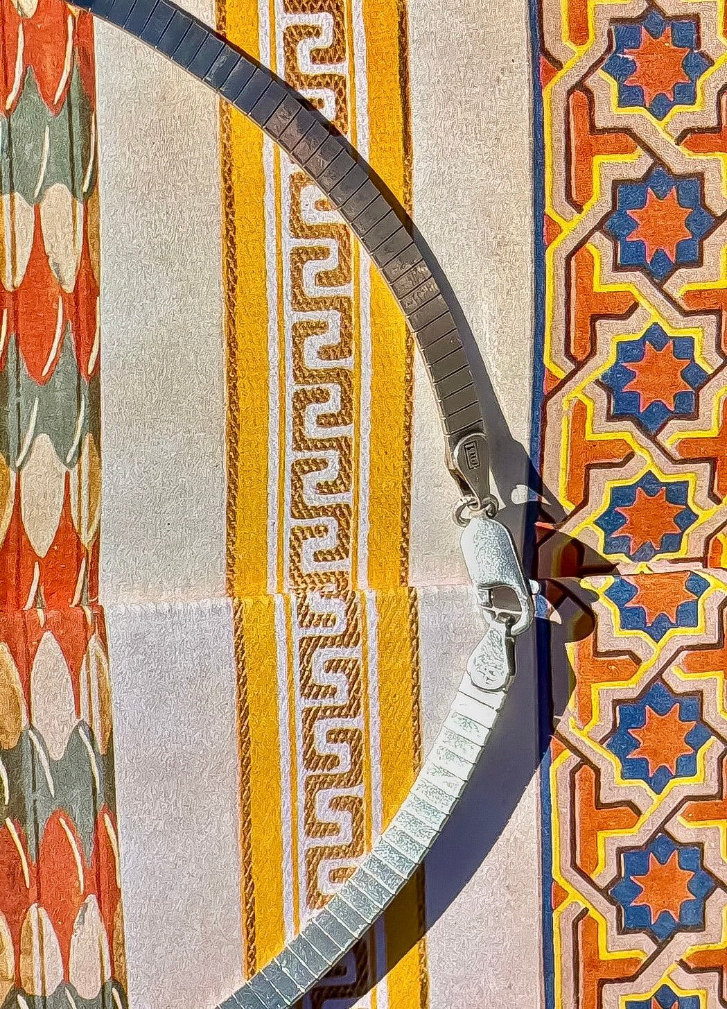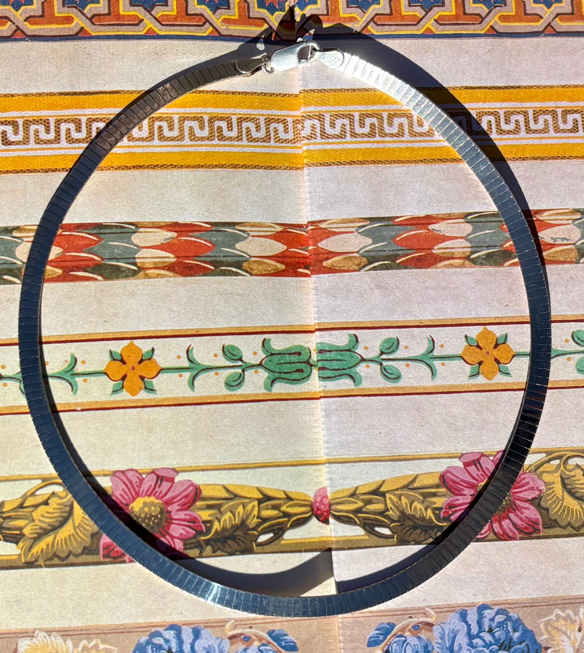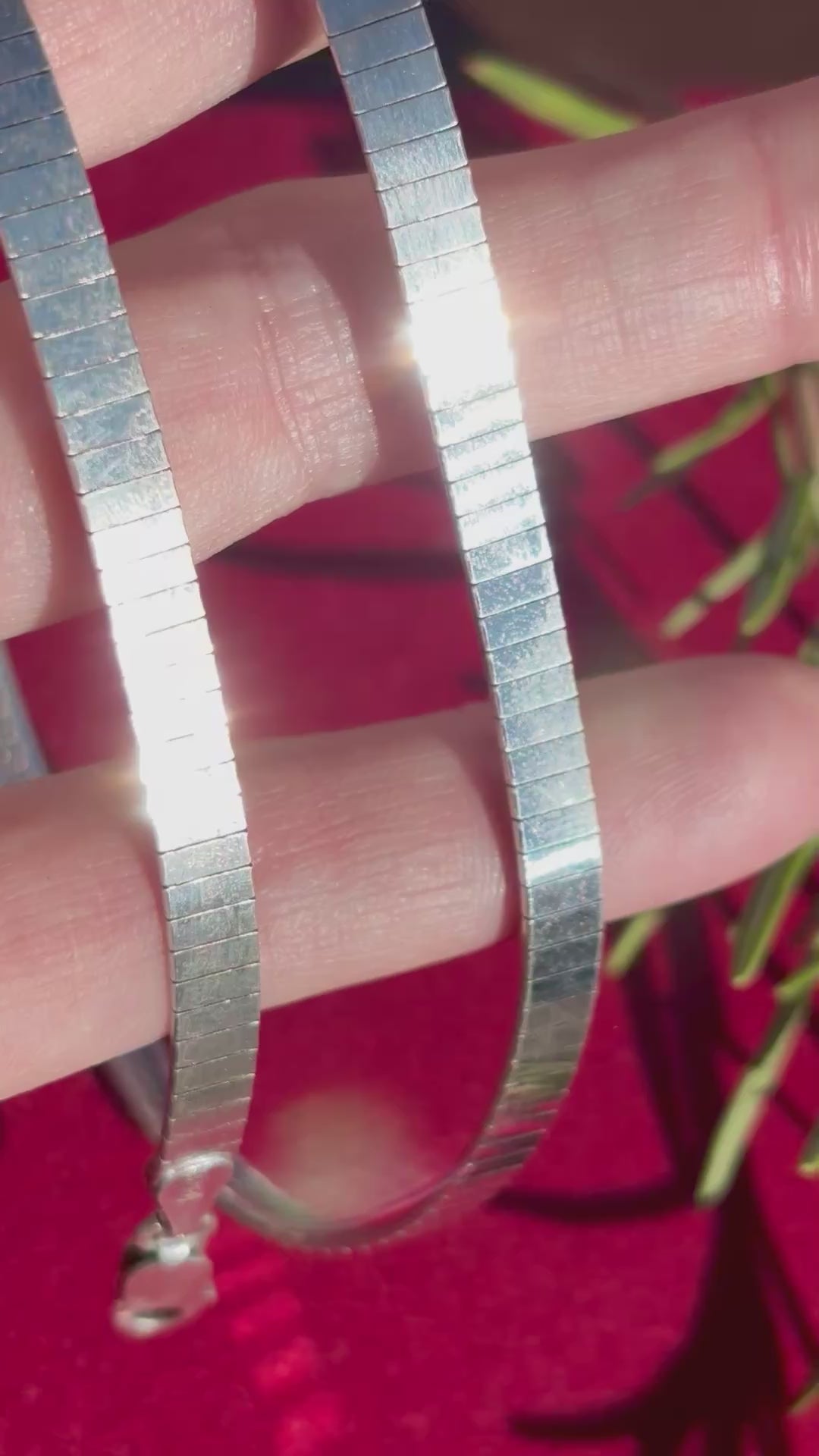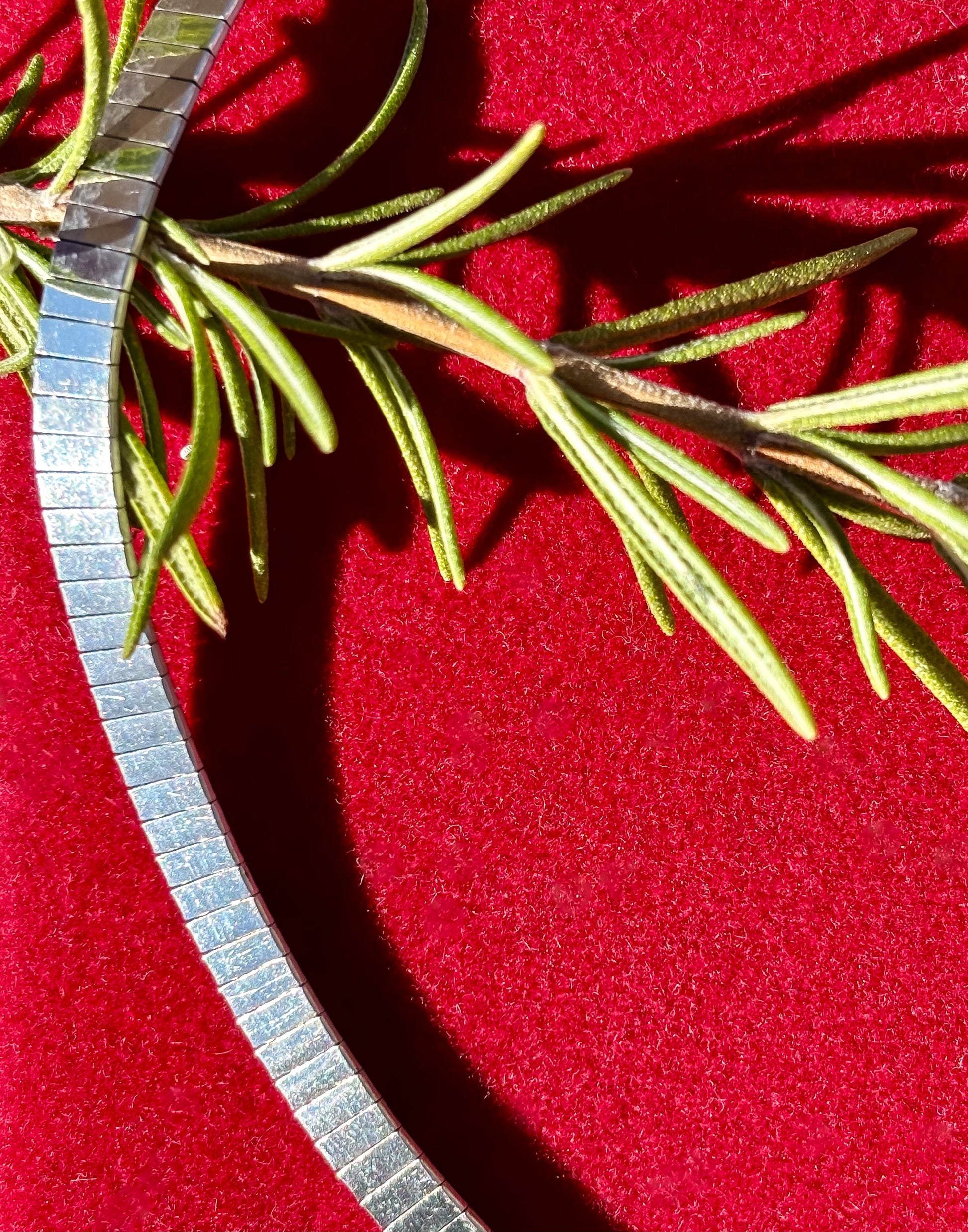 Omegas are classic for a reason!! They are workhorses, acting as a simple, stunning collar while also being able to handle bigger, weightier pendants if you choose to add one. This chain is a bit different- slim little slivers of silver are all lined up in neat little rows. When it catches the light, the facets gleam with a glittery, disco ball light show! The curved, segmented design creates a sturdy collar with a flexible, comfortable fit. The thing I love most about flat laying chains like this is how it creates a line that is almost like a bright white line of highlighter around your collarbones. Truly chic and perfect on its own but also layers nicely with other pieces, and will go with everything in your closet, (jewelry or clothing, haha).