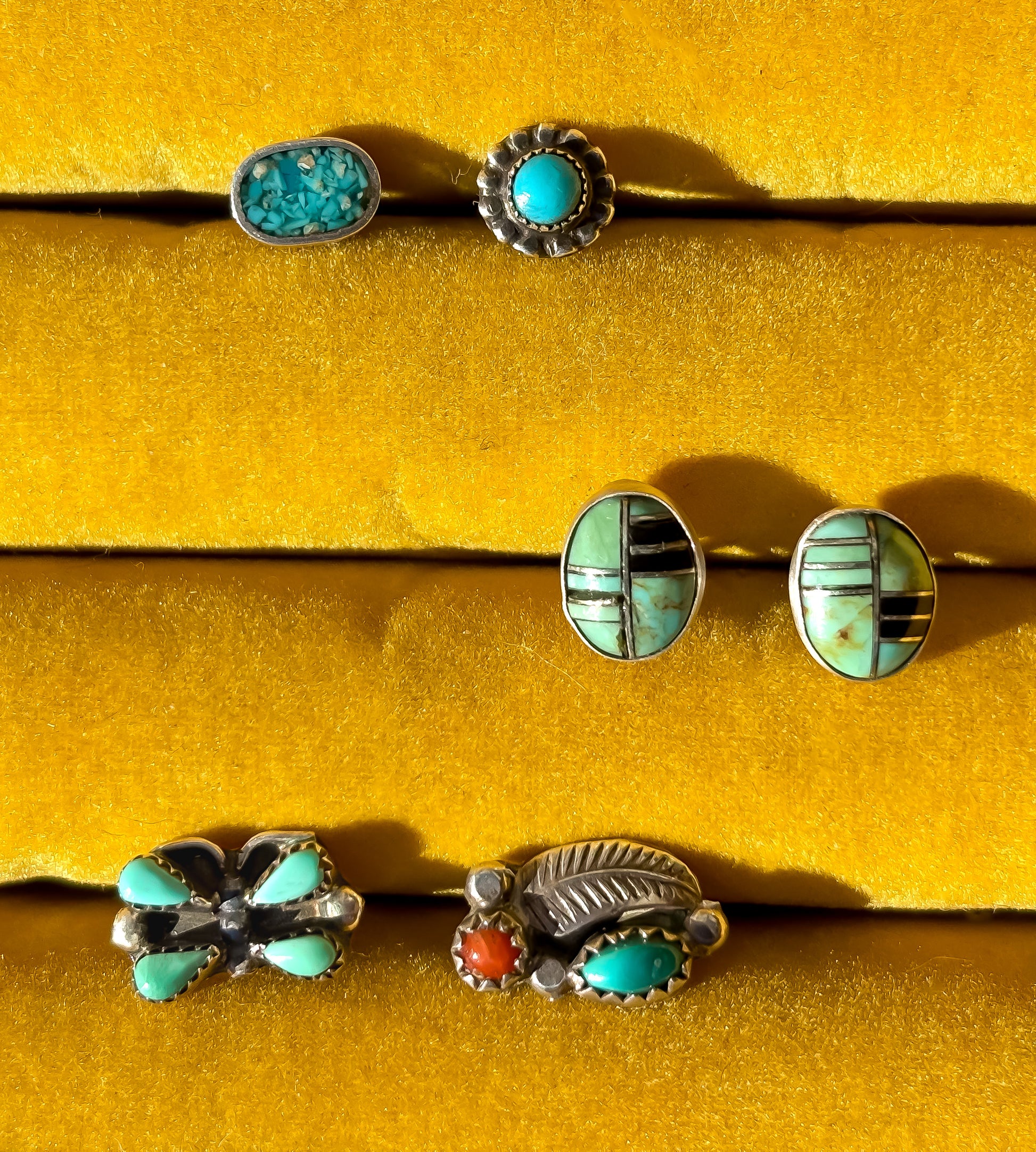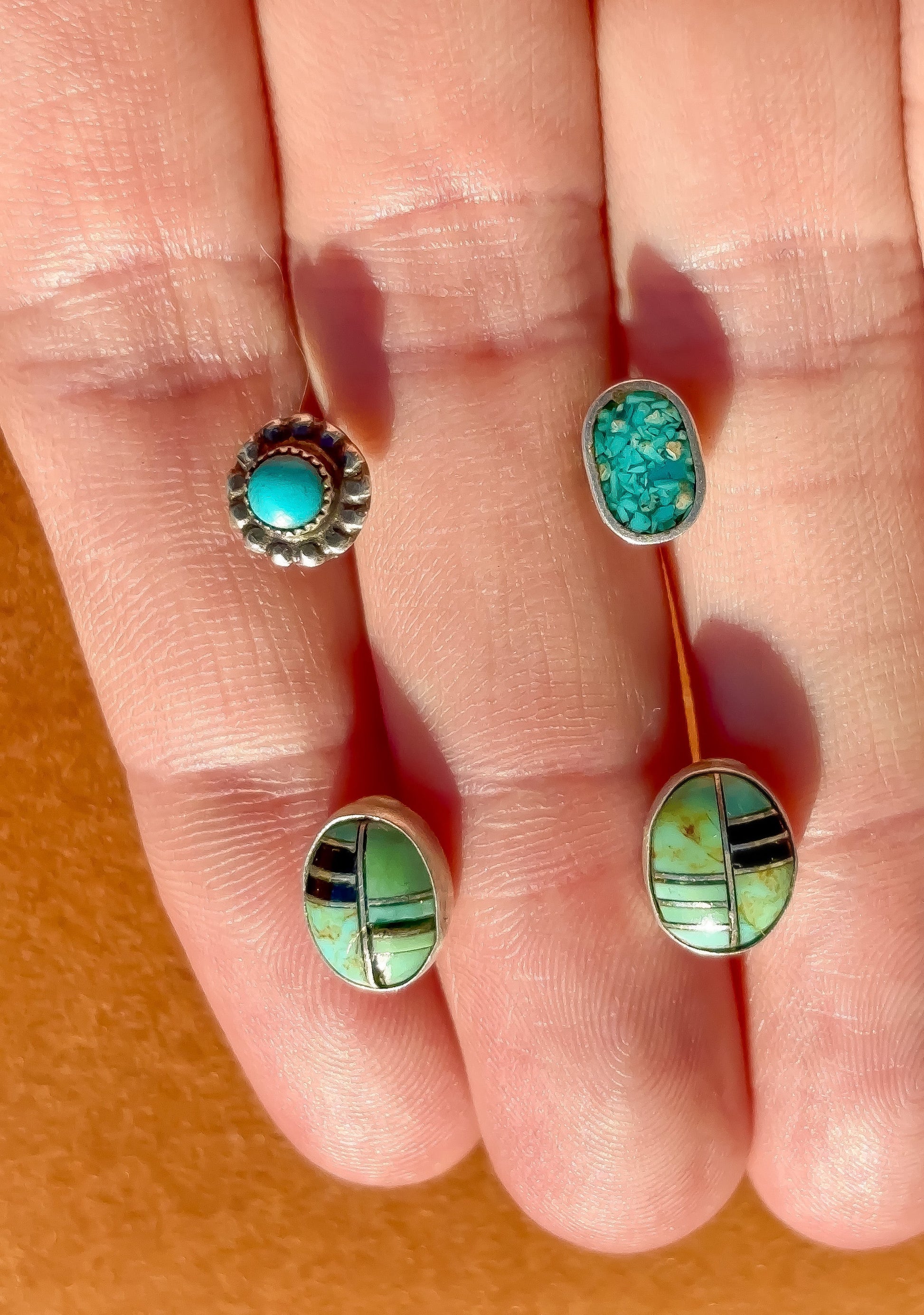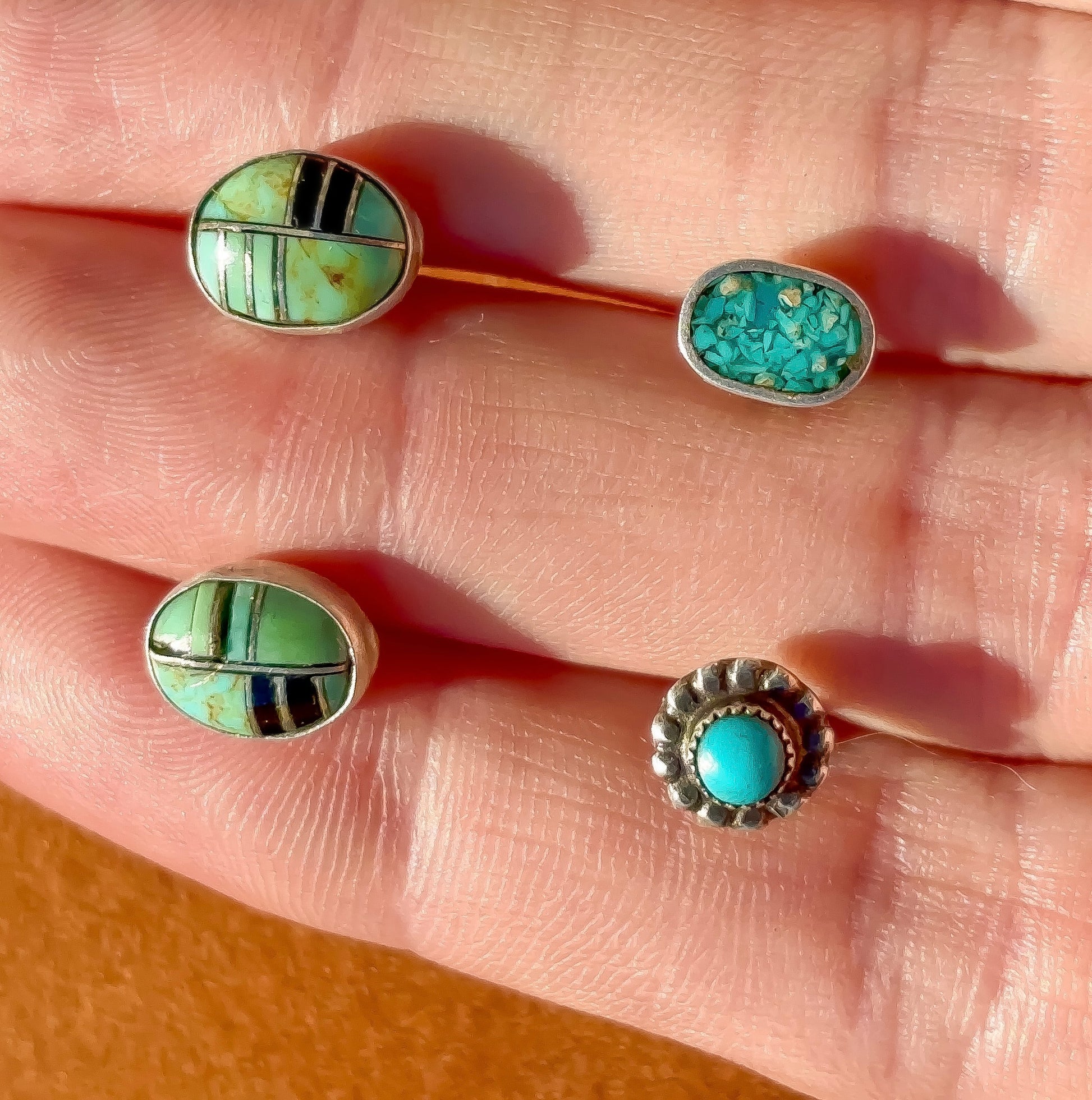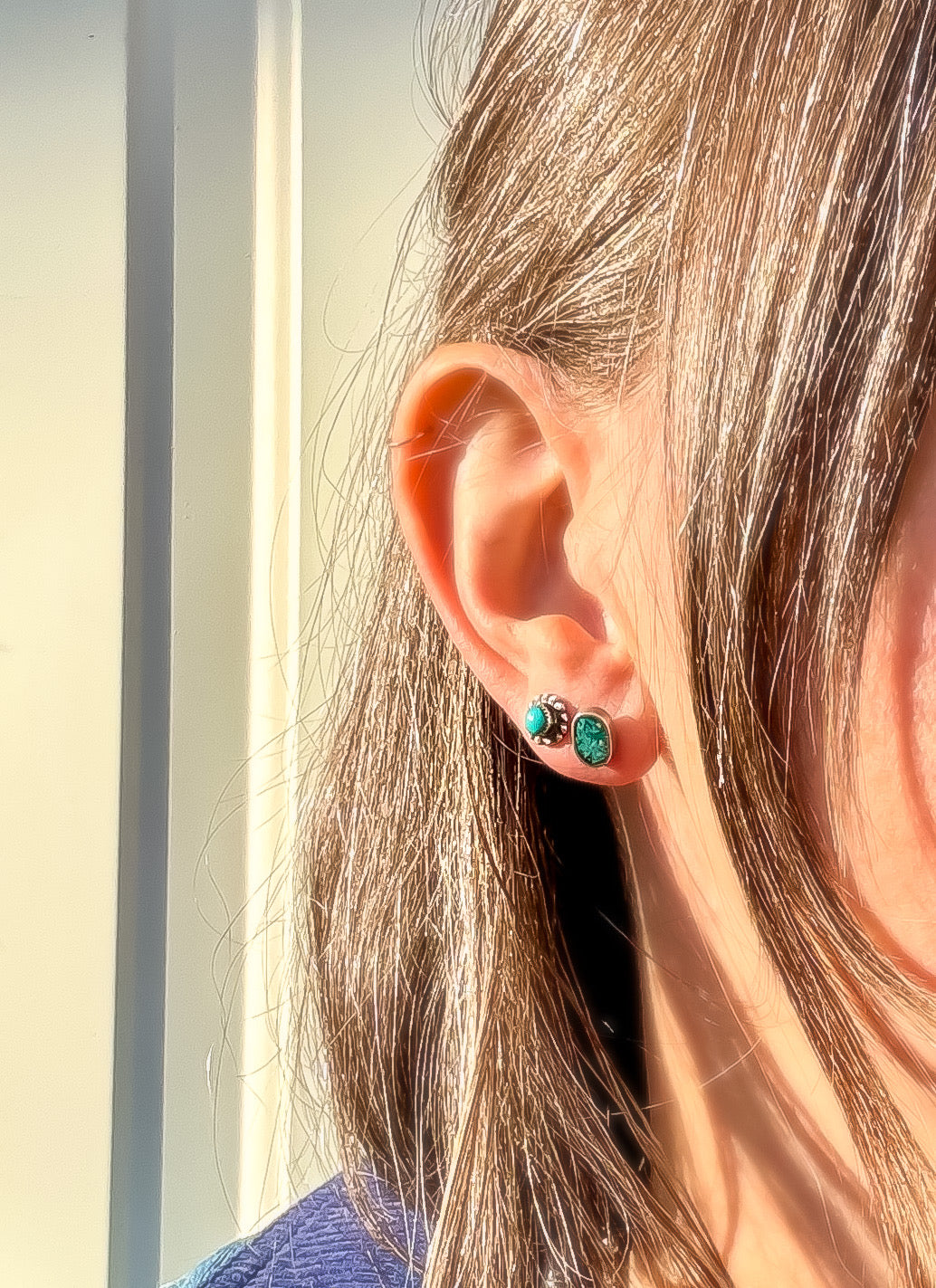 A round floral shape and a blue oval - about the same size and same color ... but different! I love these two together, great as simple but unusual every day studs or for your 2nd or 3rd piercings. These look very cute stacked up on the same ear. Easy to wear studs in silver and turquoise for those that want to mix it up a bit!