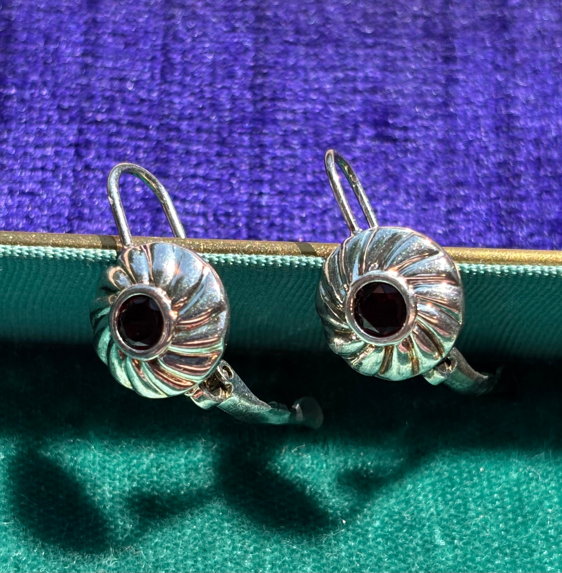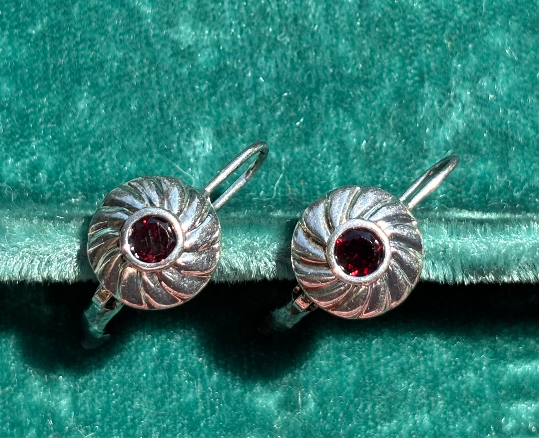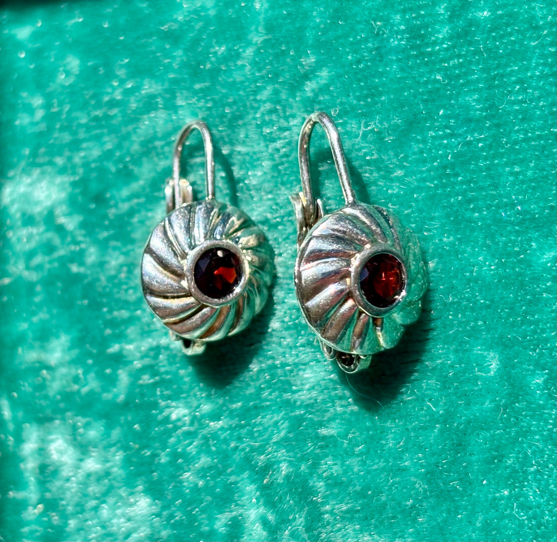 Swirls of sterling silver wrap snugly around little round faceted garnets. The garnets are a deep cherry red color and very yummy looking. These little drops are very sweet and easy to wear. I can’t help thinking about the movie Elf while looking at these-