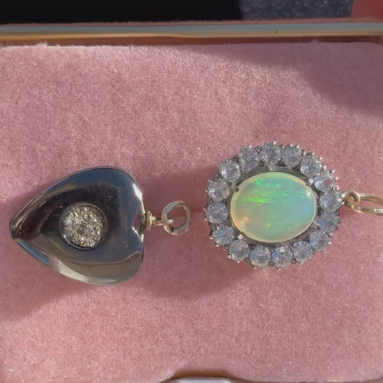 There is something charmingly wonky and heart warming about this one. An antique heart shaped pendant carved in glossy jet with a textured, subtly sparkling pyrite at its center. Jet is an organic gemstone that is formed from fossilized wood and was highly popular during the Victorian era when mourning attire (including all black jewelry) was all the rage. Jet is related to coal! I do not want to bring up how someone who was a bit of a grinch this year deserves coal in their stocking this holiday, but maybe you can make it a hilarious anecdote?! The round pyrite center shows that they really do have a heart of gold... maybe?