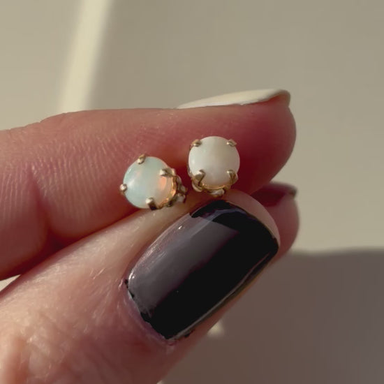 For being small, the opals really pack a punch - they have a nice rainbow flash, you'll see red, purple and green. The round shape and simple four prong setting makes for a classic look and an easy to wear pair you'll reach for again and again!