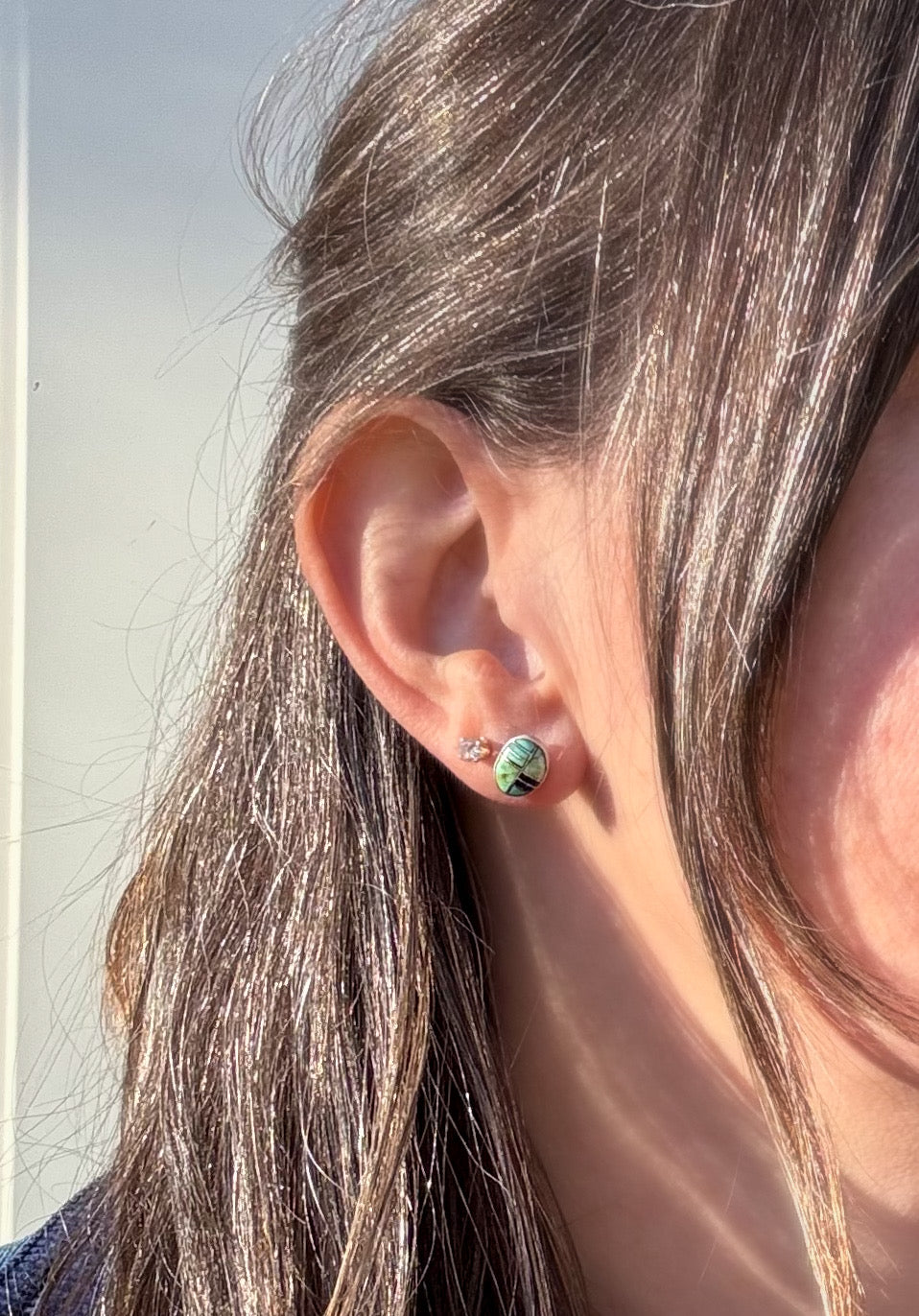 These studs are such cool examples of inlay! Each earring is an oval segmented into 4 equal parts, two are left as wedge shape quadrants of turquoise, and the other two are striped with onyx and silver lines. The overall look is simple, but graphic and geometric.